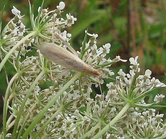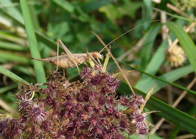 The Tree Cricket Oecanthus pellucens has been found in Jersey for the last two years. It has been known in the Chausey Islands since 2001. The first Jersey records were in 2010 when I found two immature males near St Ouens Bay and later in the year the song was heard in the same area. In 2011 several individuals of both sexes were discovered within a four hundred yards of the same spot. The easiest way to find the cricket is to look in wild carrot flowers where they apparently sit and eat the flowers and young fruit.